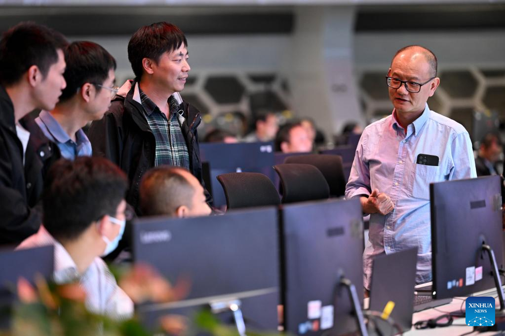Gong Xianzu (1st R), a researcher at the Institute of Plasma Physics of the Chinese Academy of Sciences (ASIPP) who is in charge of an experiment in the steady-state high confinement plasma operation of the experimental advanced superconducting tokamak (EAST), communicates with colleagues at the control center of the EAST in Hefei, east China's Anhui Province, April 12, 2023.