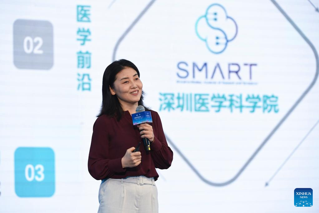 Yan Ning, president of the Shenzhen Medical Academy of Research and Translation and director of the Shenzhen Bay Laboratory, delivers a speech during the Guangming Science City Forum in Shenzhen, south China's Guangdong Province, April 27, 2023. The first Guangming Science City Forum kicked off in Shenzhen on Thursday. (Xinhua/Liang Xu)
