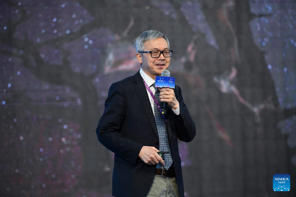 Han Jiecai, persident of the Harbin Institute of Technology, delivers a speech during the Guangming Science City Forum in Shenzhen, south China's Guangdong Province, April 27, 2023. The first Guangming Science City Forum kicked off in Shenzhen on Thursday. (Xinhua/Liang Xu)
