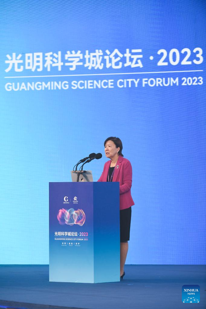 Nancy Ip, president of the Hong Kong University of Science and Technology, delivers a speech during the Guangming Science City Forum in Shenzhen, south China's Guangdong Province, April 27, 2023. The first Guangming Science City Forum kicked off in Shenzhen on Thursday. (Xinhua/Liang Xu)