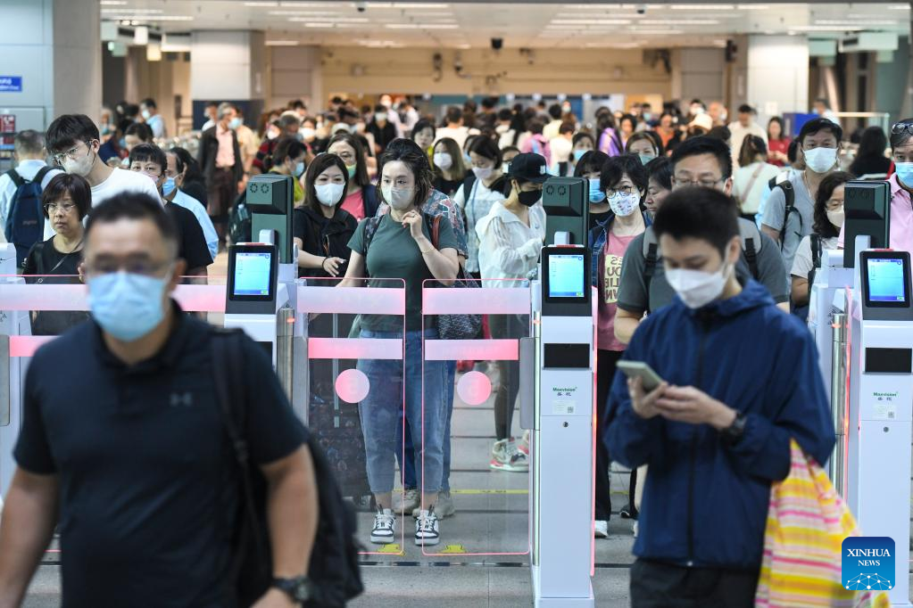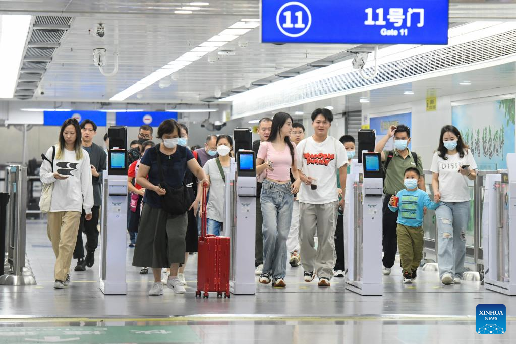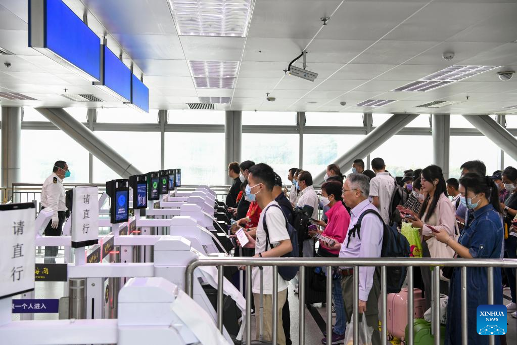 Travelers depart for Hong Kong at Luohu Port in Shenzhen, south China's Guangdong Province, on May 3, 2023. The port is handling large customs clearance volumes as the five-day May Day holiday comes to an end. (Xinhua/Liang Xu)