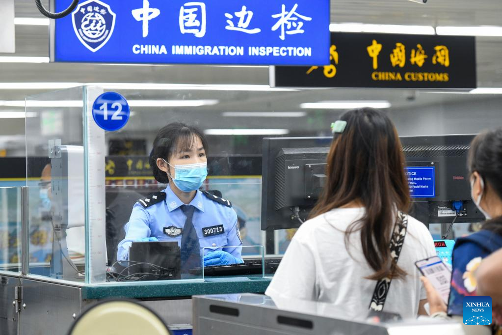 A police officer handles exit formalities of tourists at Luohu Port in Shenzhen, south China's Guangdong Province, on May 3, 2023. The port is handling large customs clearance volumes as the five-day May Day holiday comes to an end. (Xinhua/Liang Xu)