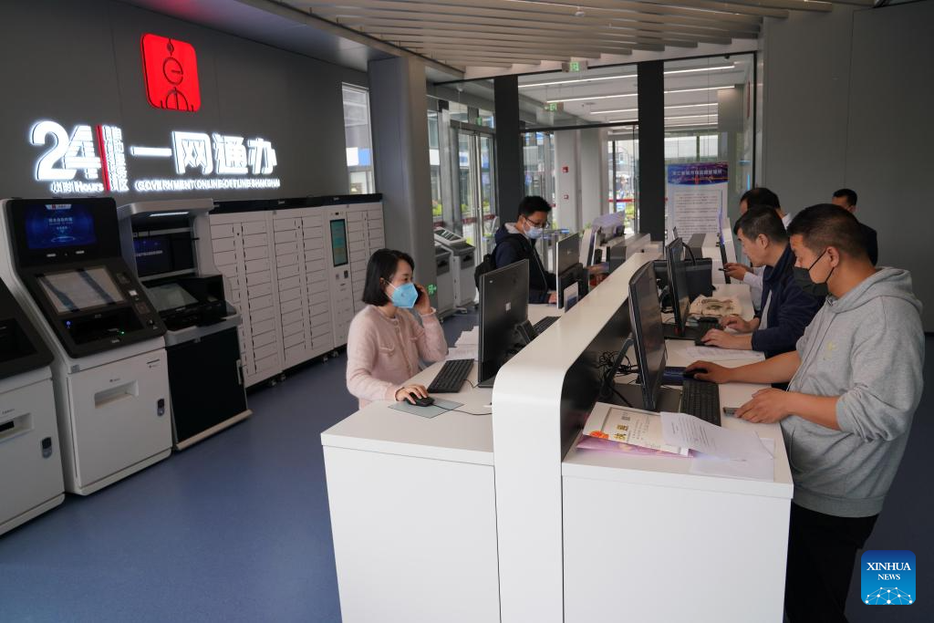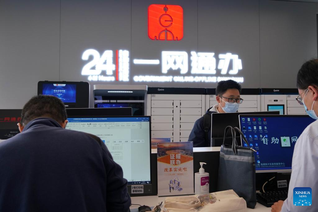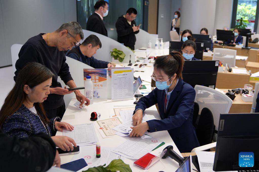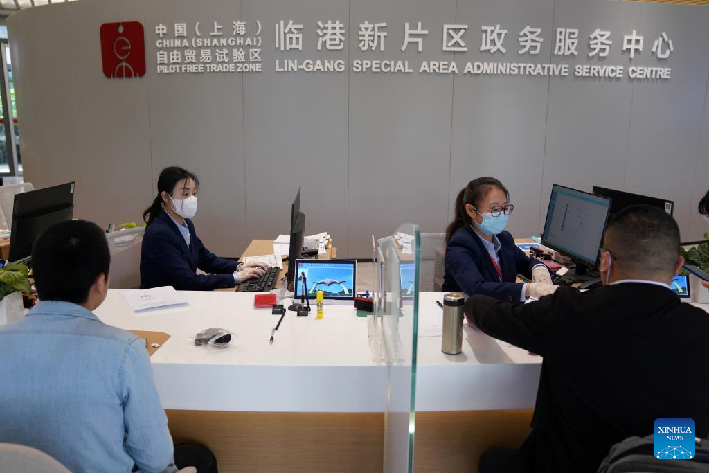 Citizens handle business at Shanghai's Pilot Free Trade Zone Lingang Special Area in east China's Shanghai, May 12, 2023. Since its establishment in 2019, Lingang Special Area has taken the improvement of business environment as an important task, making efforts to update the hardware and software facilities and personnel of the government affairs service center to better serve Shanghai-based enterprises. (Xinhua/Ma Ning)
