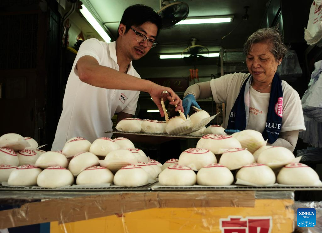 Lucky bun, a festival icon of Bun Festival, is arranged at a shop in Cheung Chau, a small island south of Hong Kong, south China, May 22, 2023.