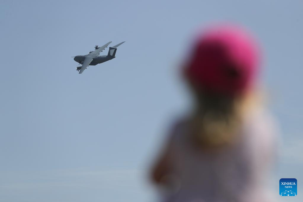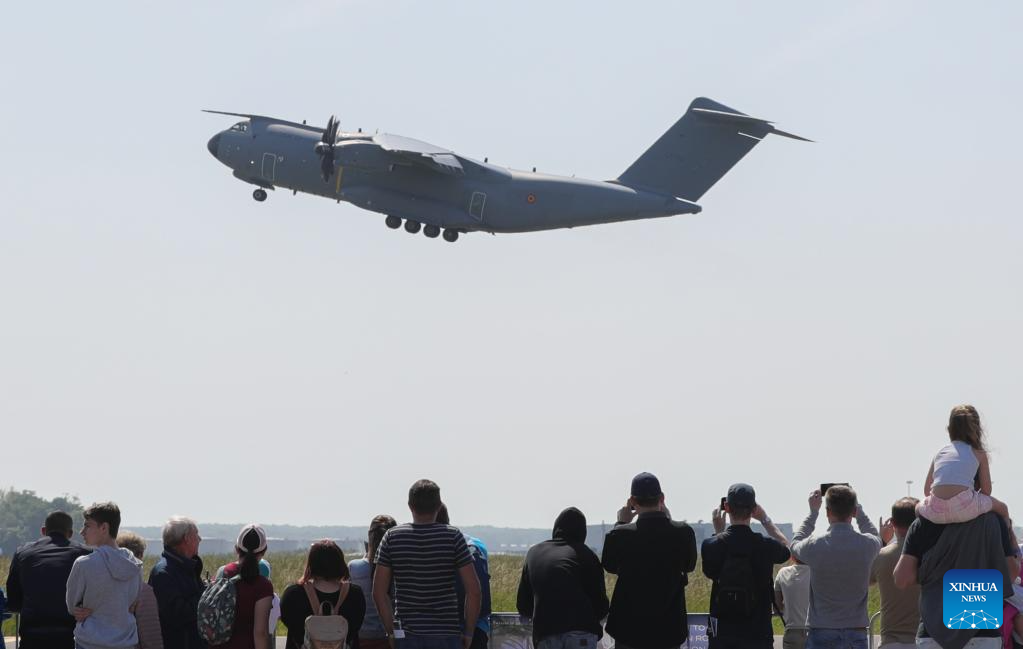 An Airbus A400M transport aircraft takes off during an open day at the Melsbroek Air Base in Steenokkerzeel, Belgium, May 27, 2023. Belgian Air Force's 15th Air Transport Wing and the Directorate of Air Support (DAFA) celebrate their 75th and 30th anniversary with two-day public open day activities on May 27 and 28. (Xinhua/Zheng Huansong)