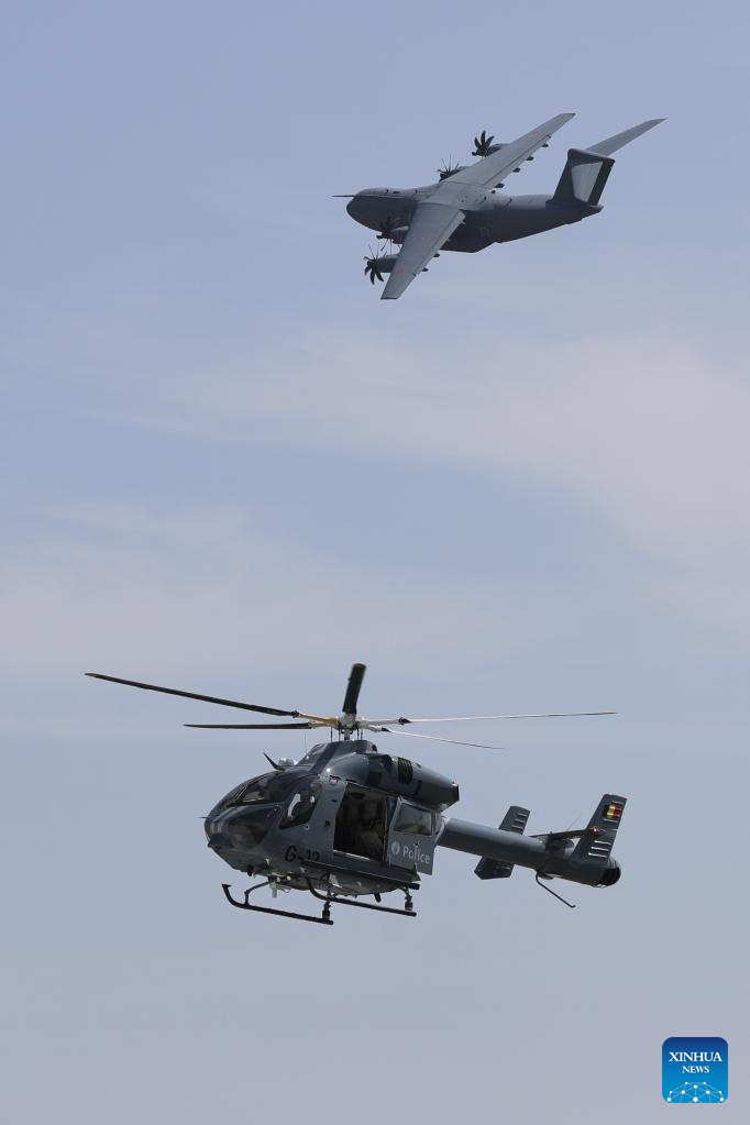 Belgian Air Force's Airbus A400M transport aircraft is seen with a Belgian Federal Police's MD902 Explorer helicopter during an open day at the Melsbroek Air Base in Steenokkerzeel, Belgium, May 27, 2023. Belgian Air Force's 15th Air Transport Wing and the Directorate of Air Support (DAFA) celebrate their 75th and 30th anniversary with two-day public open day activities on May 27 and 28. (Xinhua/Zheng Huansong)