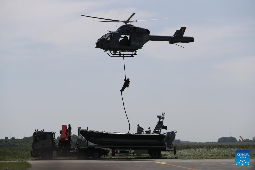 Police personnel perform fast rope demonstration during an open day at the Melsbroek Air Base in Steenokkerzeel, Belgium, May 27, 2023. Belgian Air Force's 15th Air Transport Wing and the Directorate of Air Support (DAFA) celebrate their 75th and 30th anniversary with two-day public open day activities on May 27 and 28. (Xinhua/Zheng Huansong)