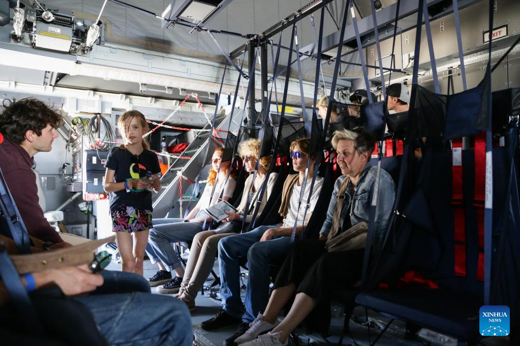People visit an Airbus A400M transport aircraft during an open day at the Melsbroek Air Base in Steenokkerzeel, Belgium, May 27, 2023. Belgian Air Force's 15th Air Transport Wing and the Directorate of Air Support (DAFA) celebrate their 75th and 30th anniversary with two-day public open day activities on May 27 and 28. (Xinhua/Zheng Huansong)