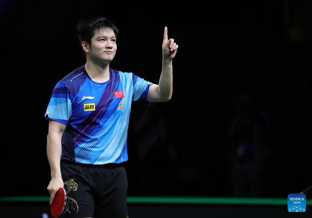 Fan Zhendong of China gestures after winning the men's singles final match against his compatriot Wang Chuqin at 2023 ITTF Table Tennis World Championships Finals in Durban, South Africa, May 28, 2023. (Xinhua/Wang Dongzhen)