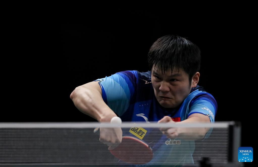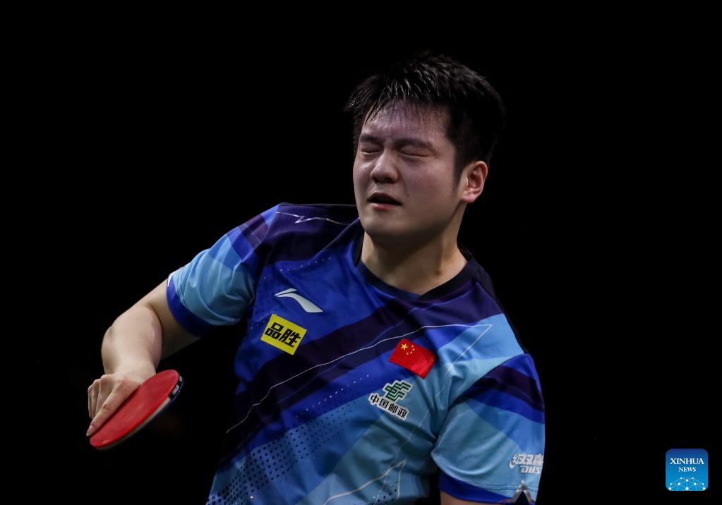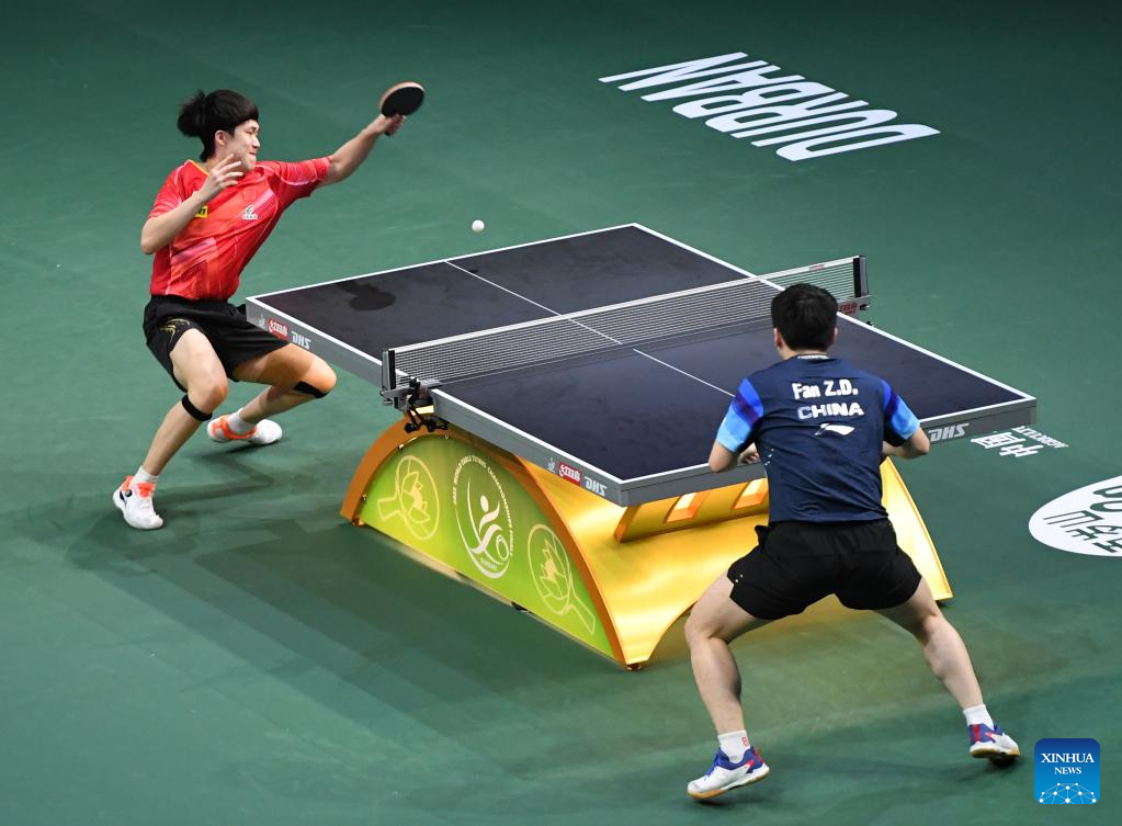 Fan Zhendong of China hits a return during the men's singles final match against his compatriot Wang Chuqin at 2023 ITTF Table Tennis World Championships Finals in Durban, South Africa, May 28, 2023. (Xinhua/Zhang Yudong)