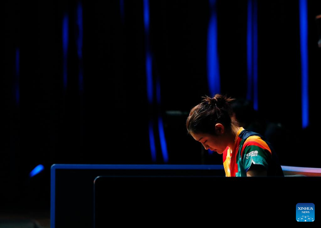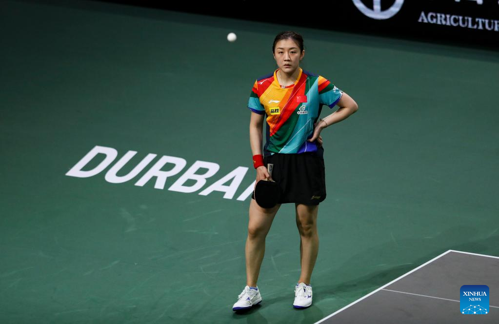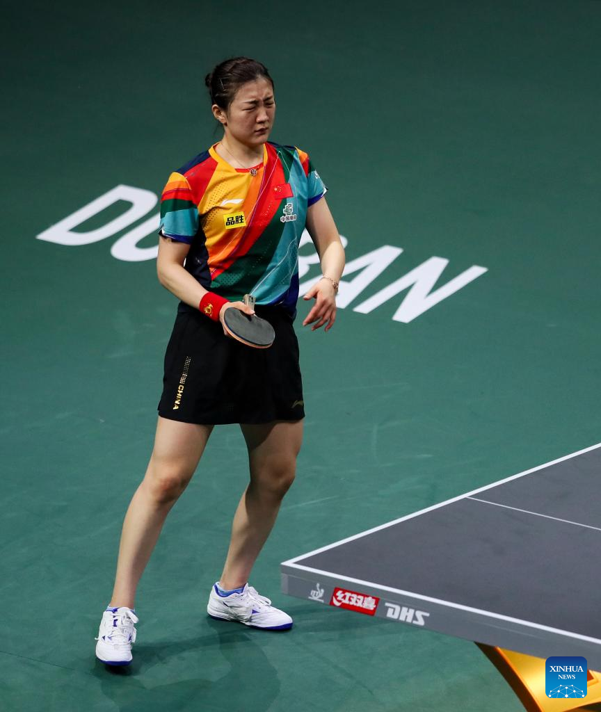 Chen Meng of China reacts during the women's singles final match against her compatriot Sun Yingsha at 2023 ITTF Table Tennis World Championships Finals in Durban, South Africa, May 28, 2023. (Xinhua/Zhang Yudong)