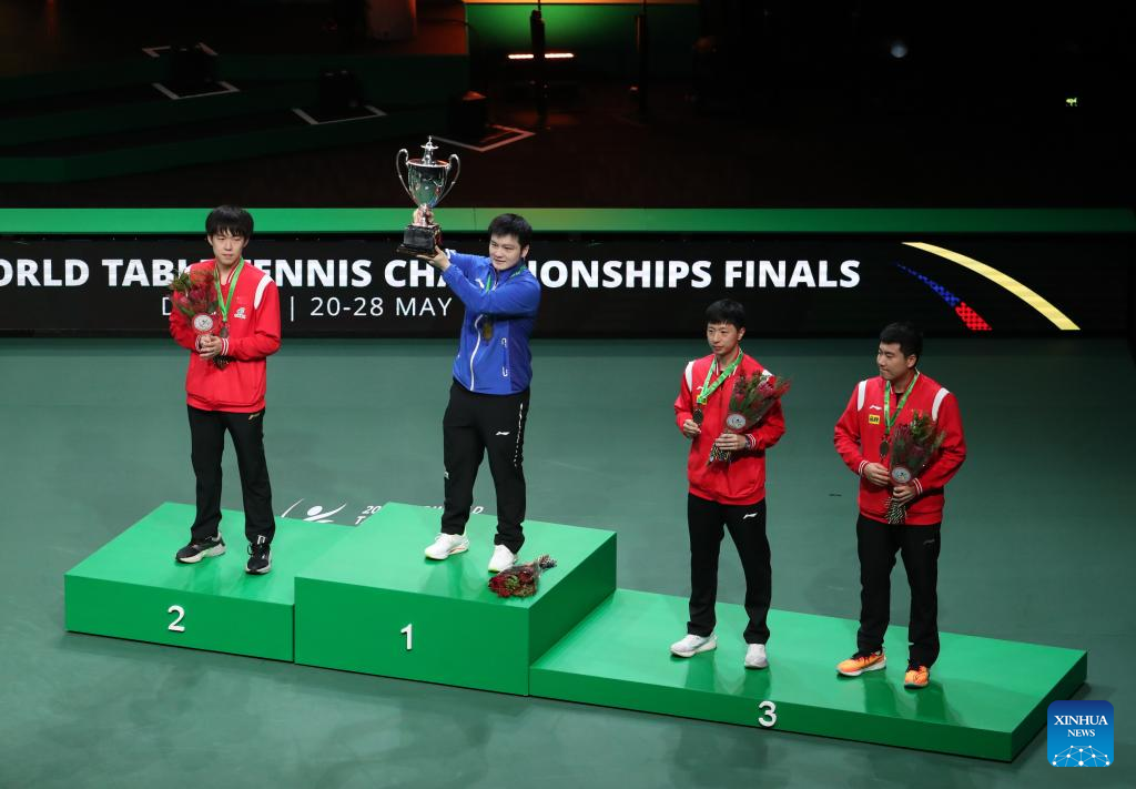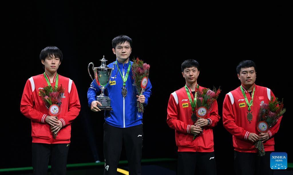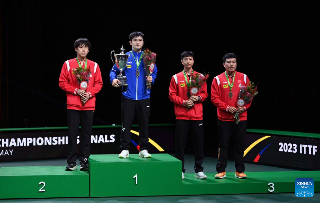 Gold medalist Fan Zhendong (2nd L) of China, silver medalist Wang Chuqin (1st L) of China and bronze medalists Ma Long (2nd R) and Liang Jingkun of China attend the awarding ceremony for the men's singles event at 2023 ITTF Table Tennis World Championships Finals in Durban, South Africa, May 28, 2023. (Xinhua/Han Xu)
