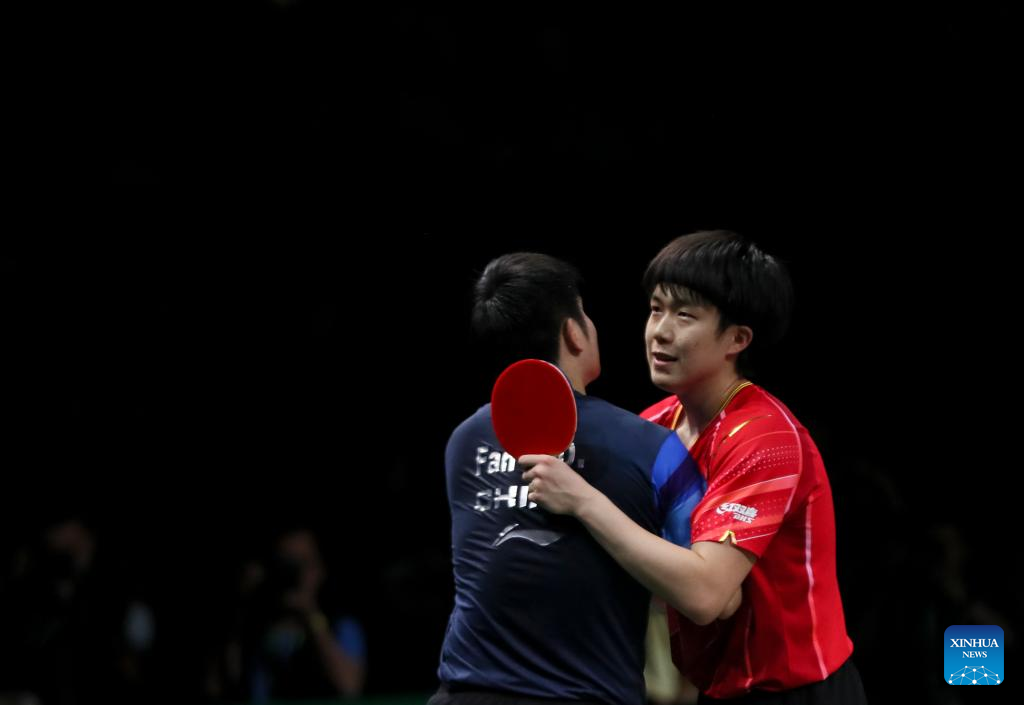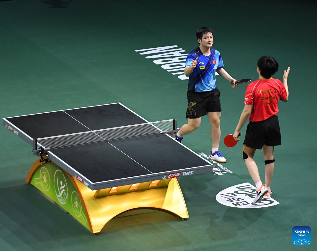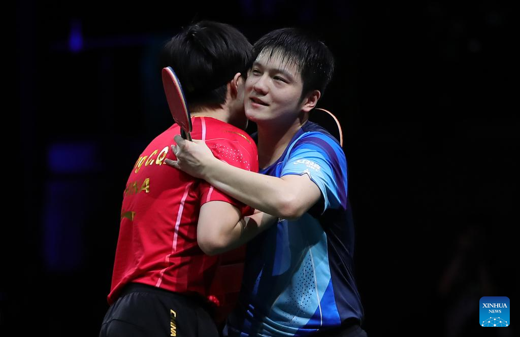 Fan Zhendong of China (R) greets his compatriot Wang Chuqin after winning the men's singles final match at 2023 ITTF Table Tennis World Championships Finals in Durban, South Africa, May 28, 2023. (Xinhua/Wang Dongzhen)