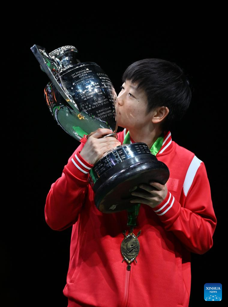 Gold medalist Sun Yingsha of China kisses the trophy during the awarding ceremony for the women's singles event at 2023 ITTF Table Tennis World Championships Finals in Durban, South Africa, May 28, 2023. (Xinhua/Tao Xiyi)