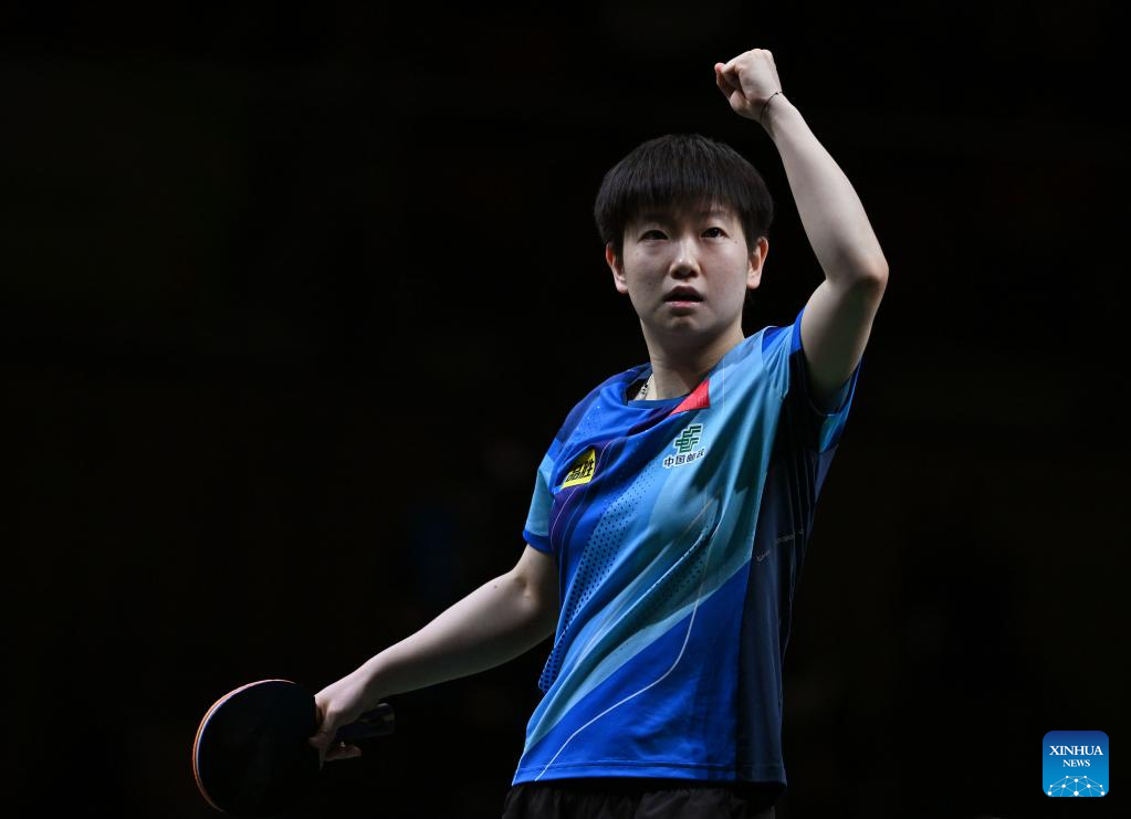 Sun Yingsha of China celebrates scoring during the women's singles final match against her compatriot Chen Meng at 2023 ITTF Table Tennis World Championships Finals in Durban, South Africa, May 28, 2023. (Xinhua/Tao Xiyi)