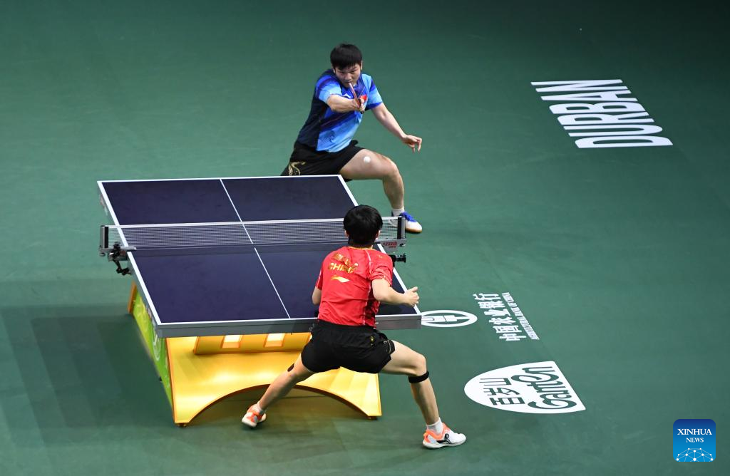 China's Fan Zhendong (top) hits a return during the men's singles final match against his compatriot Wang Chuqin at 2023 ITTF Table Tennis World Championships Finals in Durban, South Africa, May 28, 2023. (Xinhua/Li Yahui)