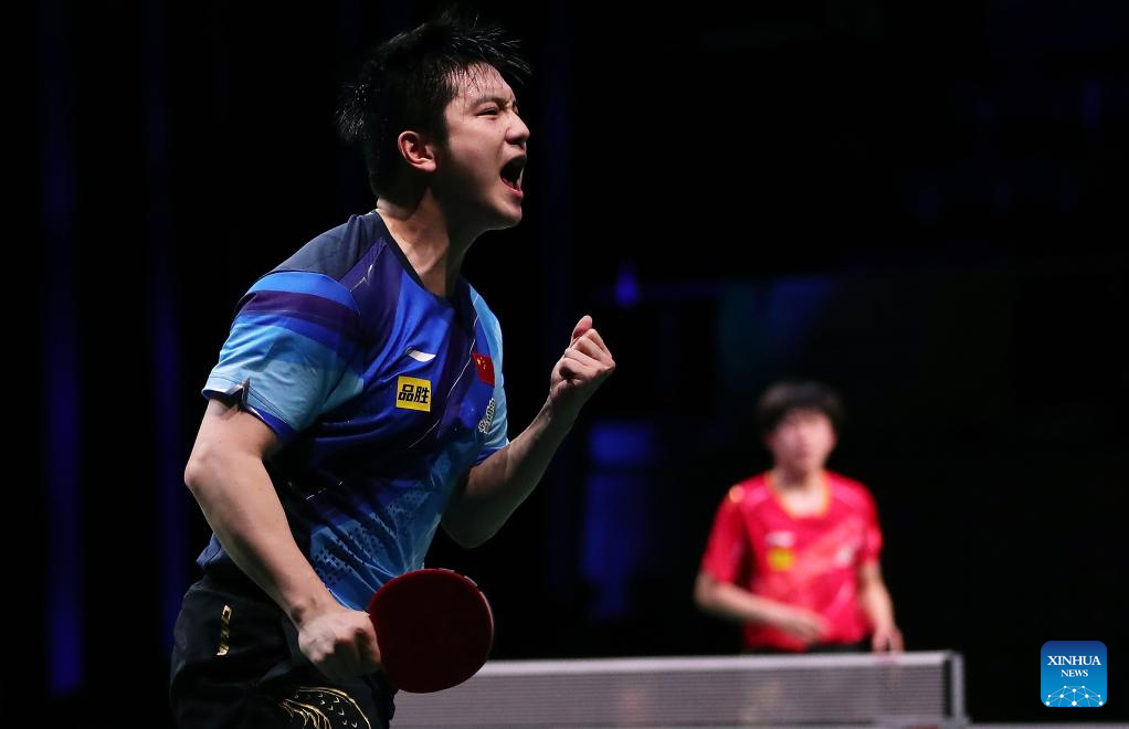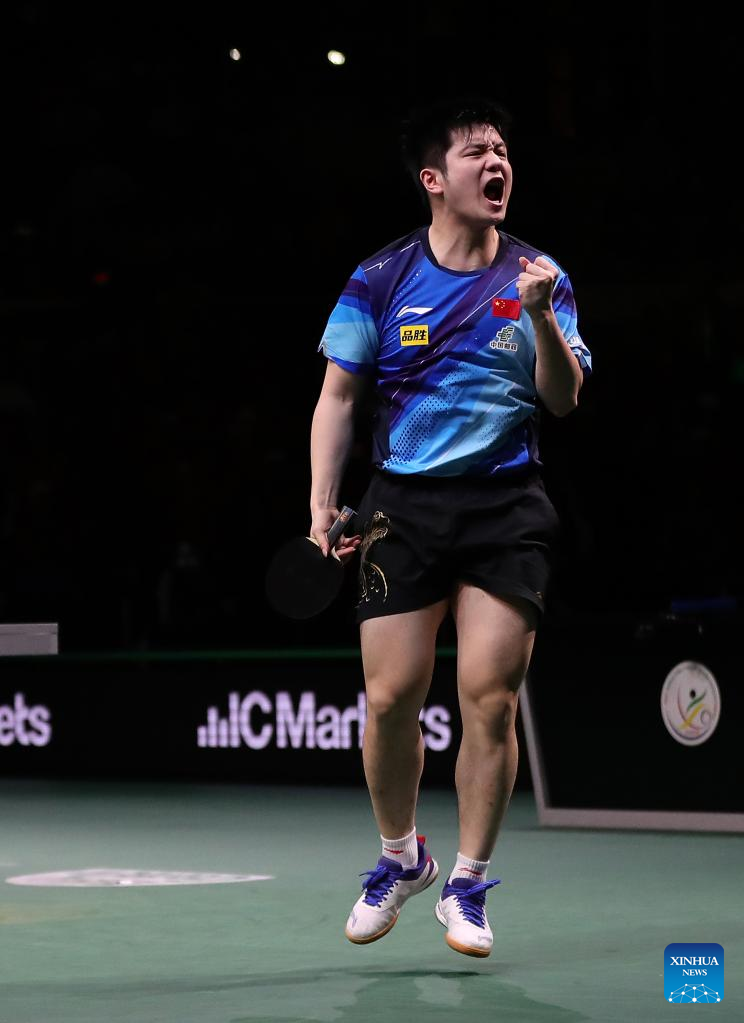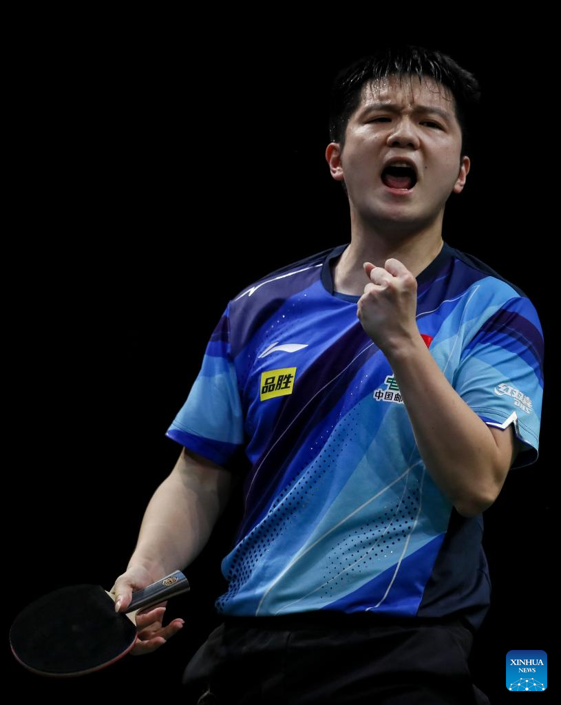 Fan Zhendong of China celebrates during the men's singles final match against his compatriot Wang Chuqin at 2023 ITTF Table Tennis World Championships Finals in Durban, South Africa, May 28, 2023. (Xinhua/Zhang Yudong)