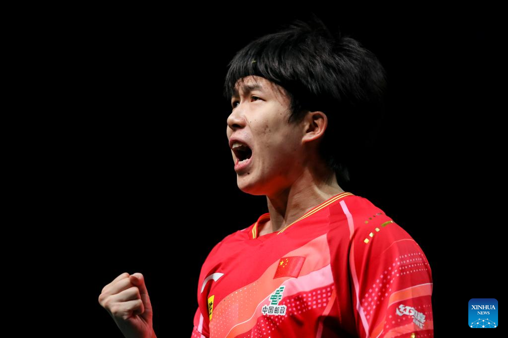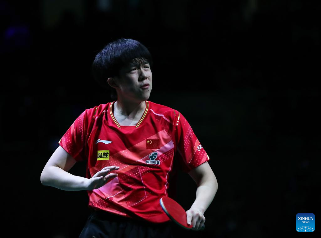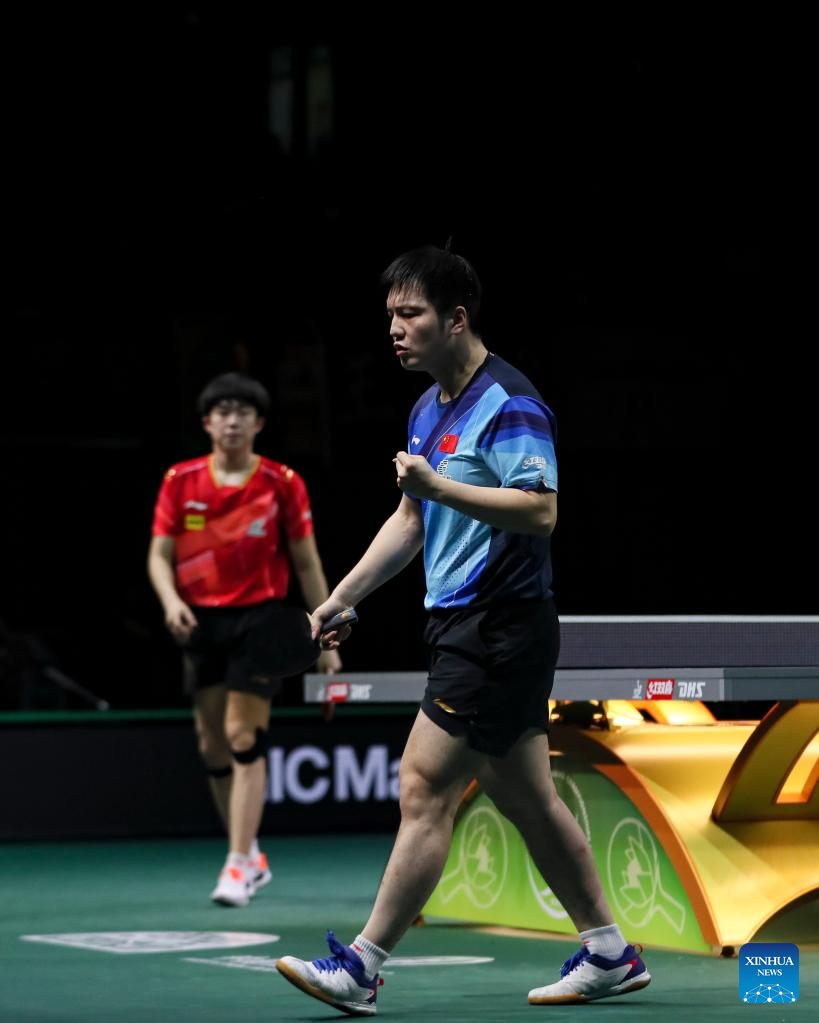 Wang Chuqin of China reacts during the men's singles final match against his compatriot Fan Zhendong at 2023 ITTF Table Tennis World Championships Finals in Durban, South Africa, May 28, 2023. (Xinhua/Zhang Yudong)