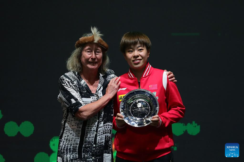 Wang Yidi (R) of China is awarded the Richard Bergmann Fair Play Trophy at 2023 ITTF Table Tennis World Championships Finals in Durban, South Africa, May 28, 2023. (Xinhua/Wang Dongzhen)