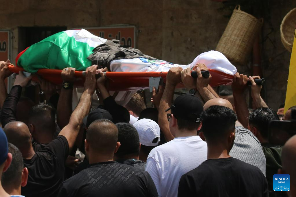 Mourners carry the body of Ashraf Ibrahim during his funeral in the West Bank city of Jenin, May 29, 2023. (Photo by Nidal Eshtayeh/Xinhua)