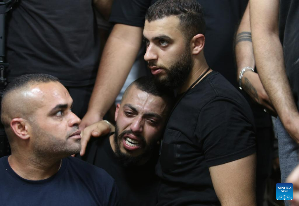 A relative of Ashraf Ibrahim mourns during his funeral in the West Bank city of Jenin, May 29, 2023. (Photo by Nidal Eshtayeh/Xinhua)