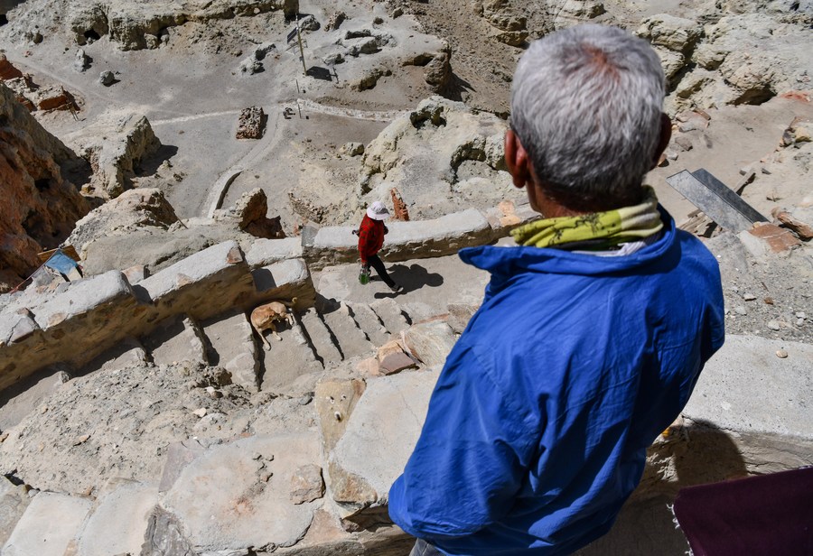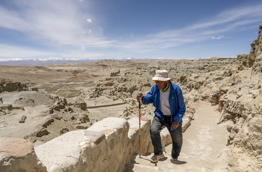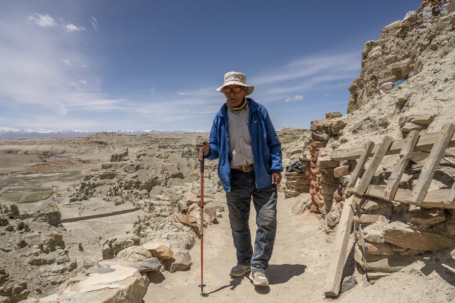 Rigzin Wangzhab walks between grottoes in Zanda County of Ngari Prefecture, southwest China's Tibet Autonomous Region, May 26, 2023. (Xinhua/Fei Maohua)