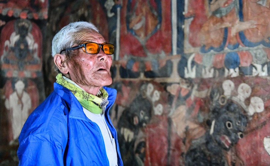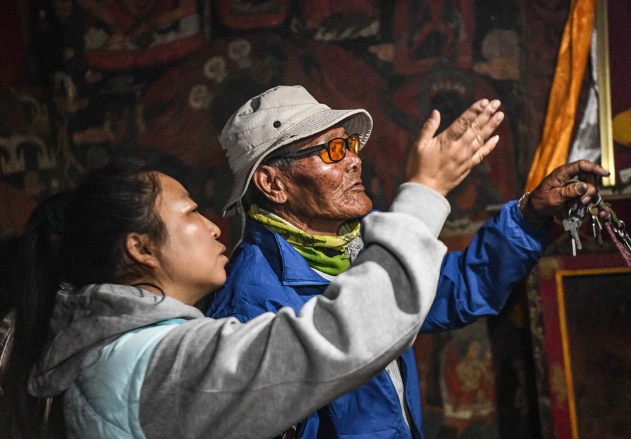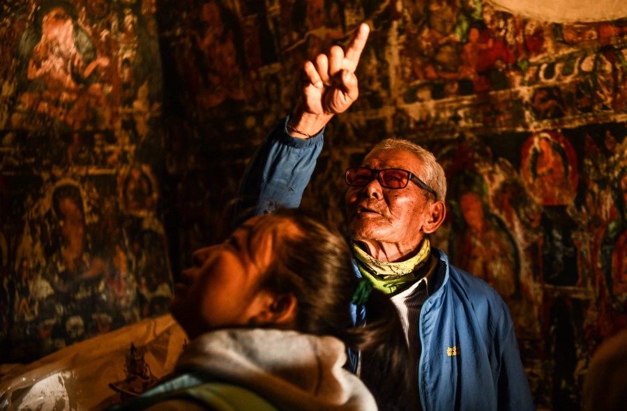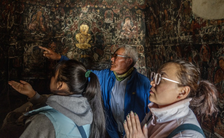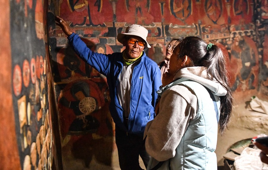 Rigzin Wangzhab, who has been guarding the Donggar and Piyang grottoes for more than 20 years, explains to a tourist as they look at the mural in a grotto in Zanda County of Ngari Prefecture, southwest China's Tibet Autonomous Region, May 26, 2023. Known as the Donggar and Piyang grottoes, the 1,000-year-old caverns in the Tibet Autonomous Region's Ngari Prefecture hold one of the world's greatest collections of Tibetan Buddhist murals. Frescoes that are currently open to the public mainly depict Buddhas, Bodhisattvas and other deities, but also feature animals that are not native to Ngari. (Xinhua/Jigme Dorje)