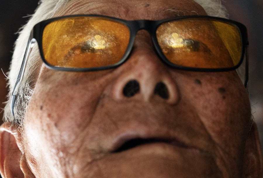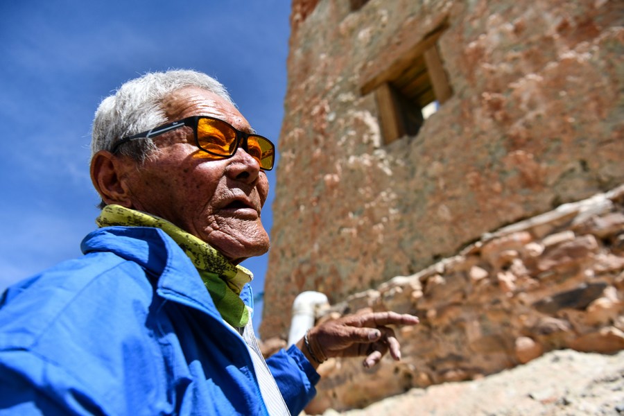 Rigzin Wangzhab looks on as his daughter-in-law brings a meal for him in Zanda County of Ngari Prefecture, southwest China's Tibet Autonomous Region, May 26, 2023. (Xinhua/Jigme Dorje)