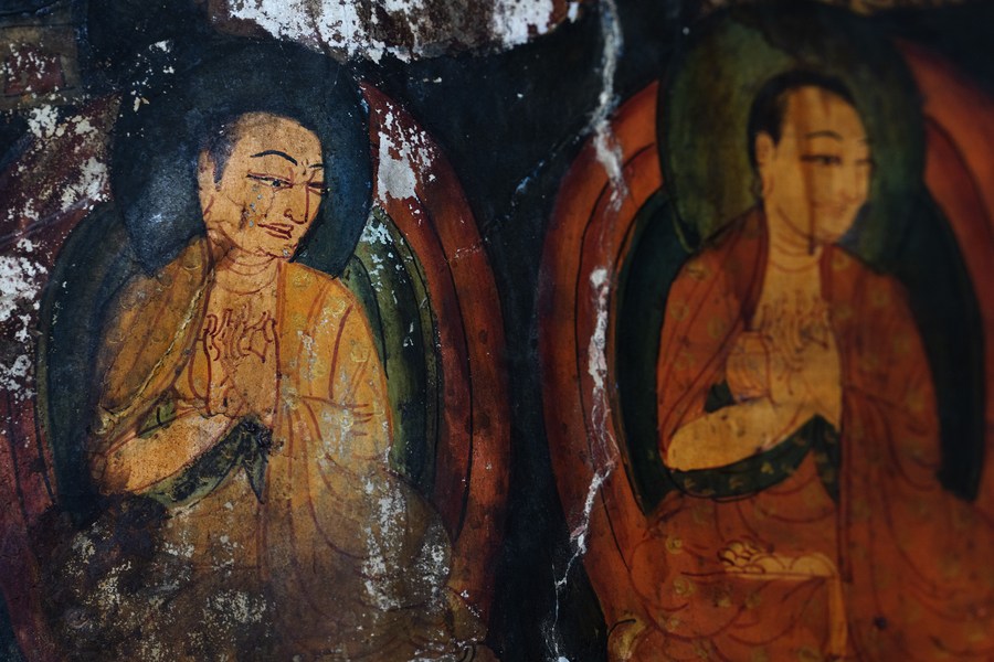 This photo taken on May 26, 2023 shows part of a mural in a grotto in Zanda County of Ngari Prefecture, southwest China's Tibet Autonomous Region. (Xinhua/Fei Maohua)