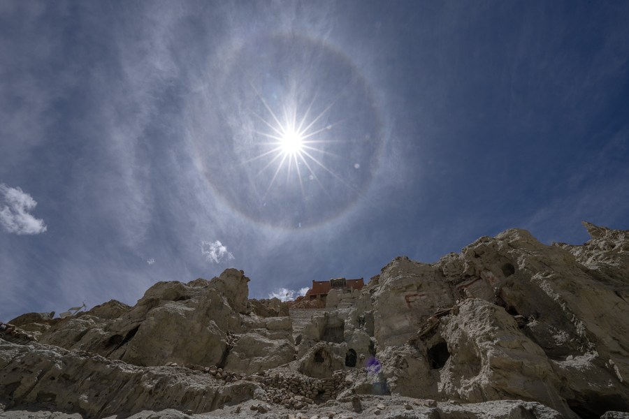 A solar halo is pictured above the Piyang grottoes in Zanda County of Ngari Prefecture, southwest China's Tibet Autonomous Region, May 26, 2023. (Xinhua/Fei Maohua)