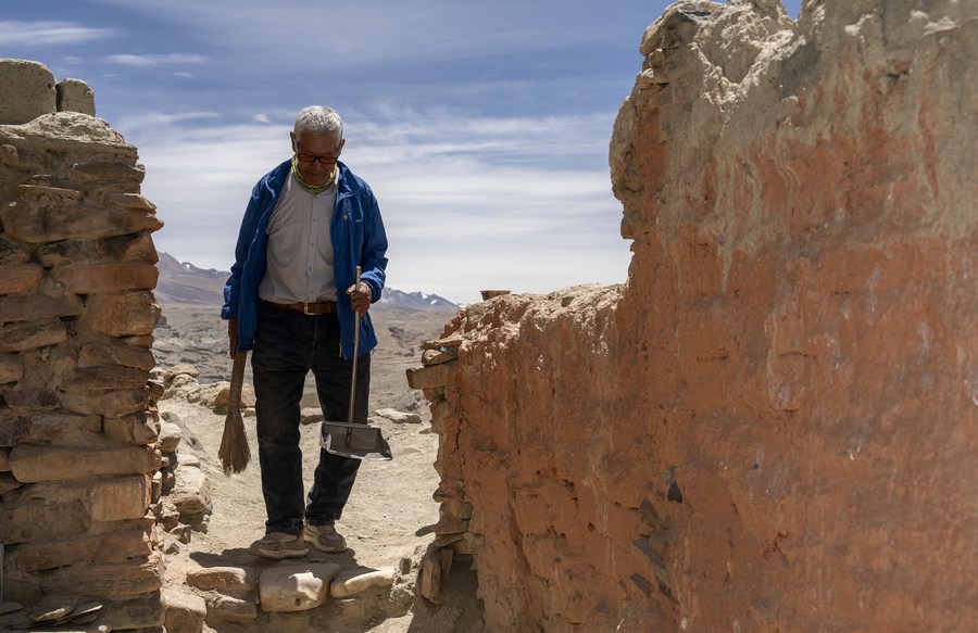 Rigzin Wangzhab prepares to clean a grotto in Zanda County of Ngari Prefecture, southwest China's Tibet Autonomous Region, May 26, 2023. (Xinhua/Fei Maohua)