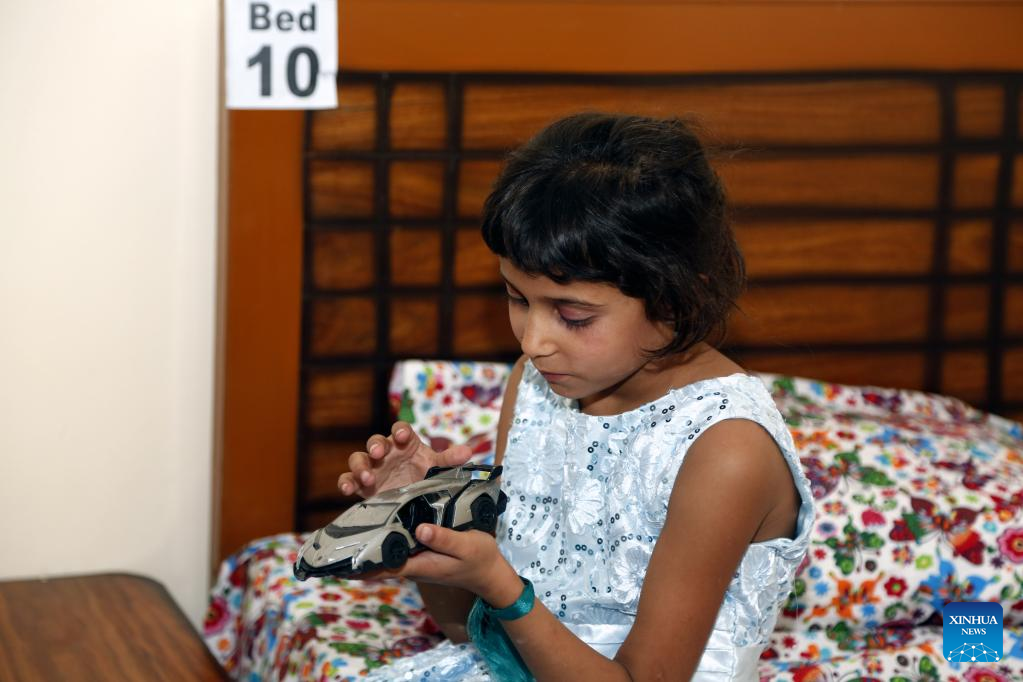 A girl plays with her toy at the China-funded compassionate home in Islamabad, Pakistan, May 28, 2023. A compassionate home formed by Chinese and Pakistani charity organizations was formally inaugurated here on Sunday to provide temporary accommodation for the relatives of children treated in hospitals for serious diseases. (Xinhua/Ahmad Kamal)