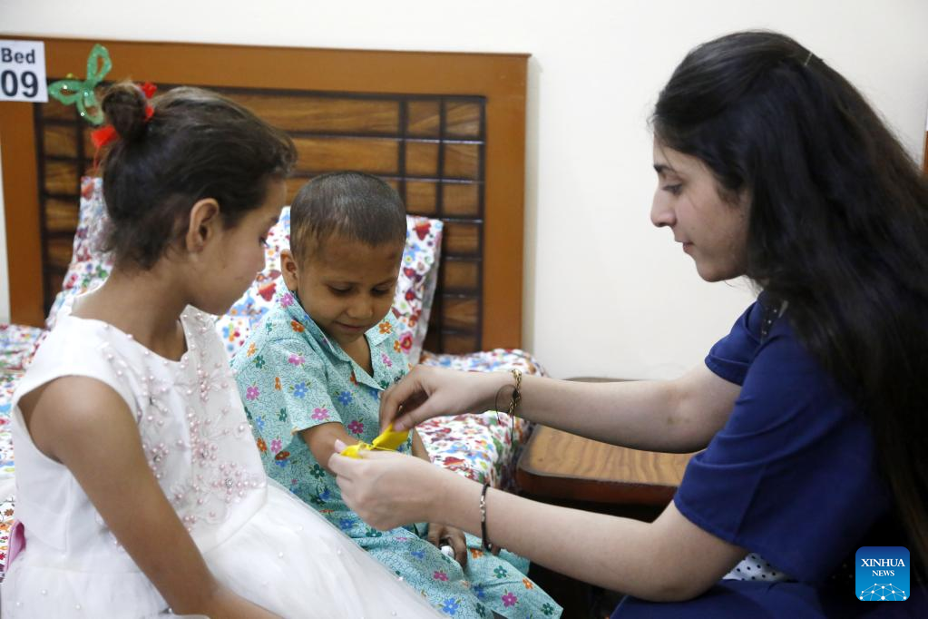 A nurse takes care of a girl at the China-funded compassionate home in Islamabad, Pakistan, May 28, 2023. A compassionate home formed by Chinese and Pakistani charity organizations was formally inaugurated here on Sunday to provide temporary accommodation for the relatives of children treated in hospitals for serious diseases. (Xinhua/Ahmad Kamal)