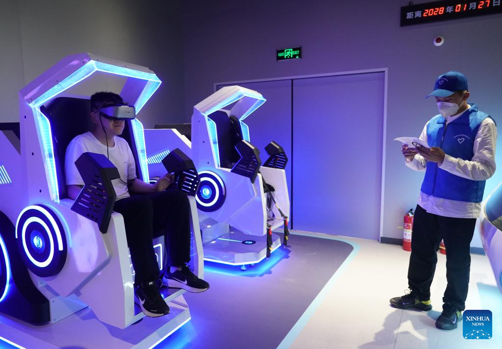 A visitor tries a VR equipment at an exhibition at China Science Fiction Convention (CSFC) 2023 in Beijing, capital of China, May 30, 2023. China Science Fiction Convention (CSFC) 2023 is scheduled to run in Beijing from May 29 to June 4. It is included as a sideline event of this year's Zhongguancun Forum (ZGC Forum) for the first time. Various events such as forums and sci-fi exhibitions are arranged in this year's convention. (Xinhua/Ren Chao)