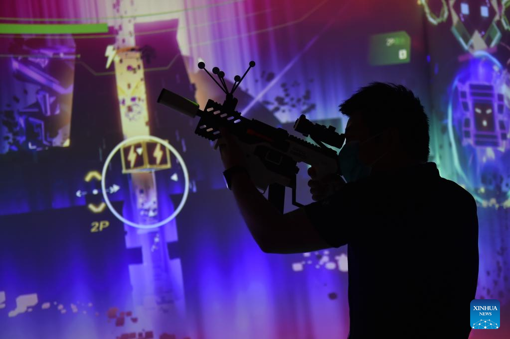 A visitor plays a VR game using motion capture technology at an exhibition at China Science Fiction Convention (CSFC) 2023 in Beijing, capital of China, May 30, 2023. China Science Fiction Convention (CSFC) 2023 is scheduled to run in Beijing from May 29 to June 4. It is included as a sideline event of this year's Zhongguancun Forum (ZGC Forum) for the first time. Various events such as forums and sci-fi exhibitions are arranged in this year's convention. (Xinhua/Chen Zhonghao)