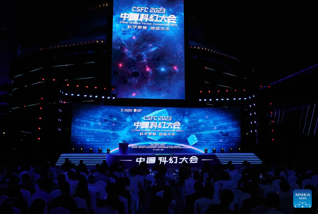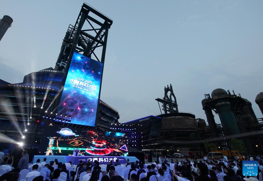 This photo taken on May 29, 2023 shows the opening ceremony of China Science Fiction Convention (CSFC) 2023 at Shougang Park in Beijing, capital of China. China Science Fiction Convention (CSFC) 2023 is scheduled to run in Beijing from May 29 to June 4. It is included as a sideline event of this year's Zhongguancun Forum (ZGC Forum) for the first time. Various events such as forums and sci-fi exhibitions are arranged in this year's convention. (Xinhua/Zhang Chenlin)
