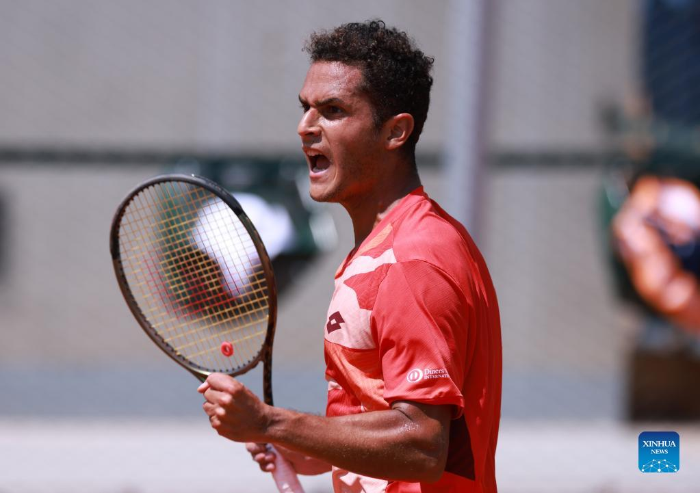 Juan Pablo Varillas of Peru reacts during the men's singles first round match against Shang Juncheng of China at the French Open tennis tournament at Roland Garros in Paris, France, May 29, 2023. (Xinhua/Gao Jing)