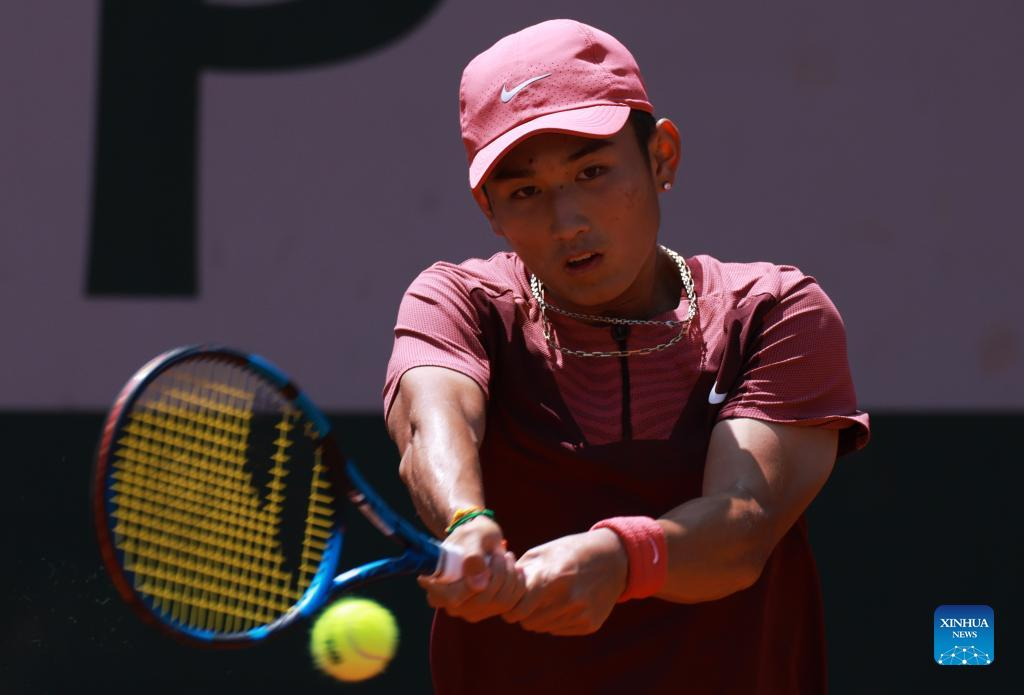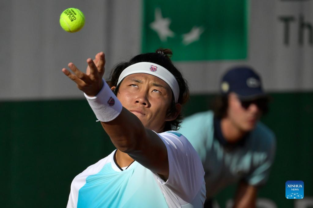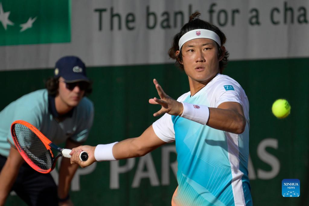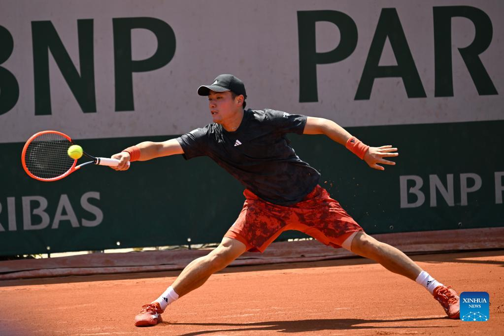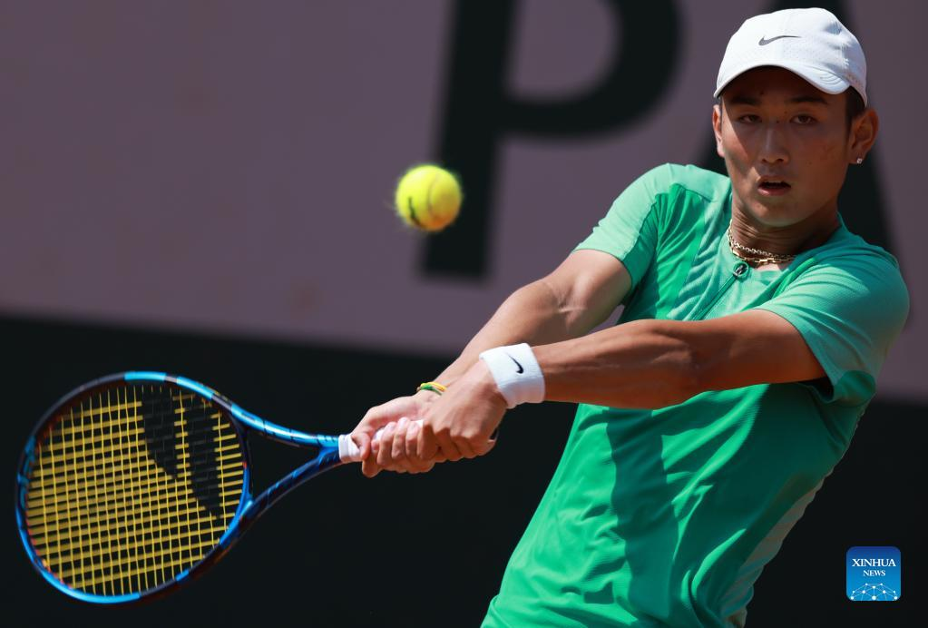 Shang Juncheng of China returns the ball during the men's singles first round match against Juan Pablo Varillas of Peru at the French Open tennis tournament at Roland Garros in Paris, France, May 29, 2023. (Xinhua/Gao Jing)