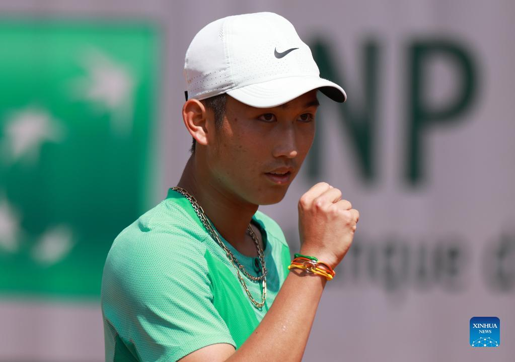 Shang Juncheng of China reacts during the men's singles first round match against Juan Pablo Varillas of Peru at the French Open tennis tournament at Roland Garros in Paris, France, May 29, 2023. (Xinhua/Gao Jing)