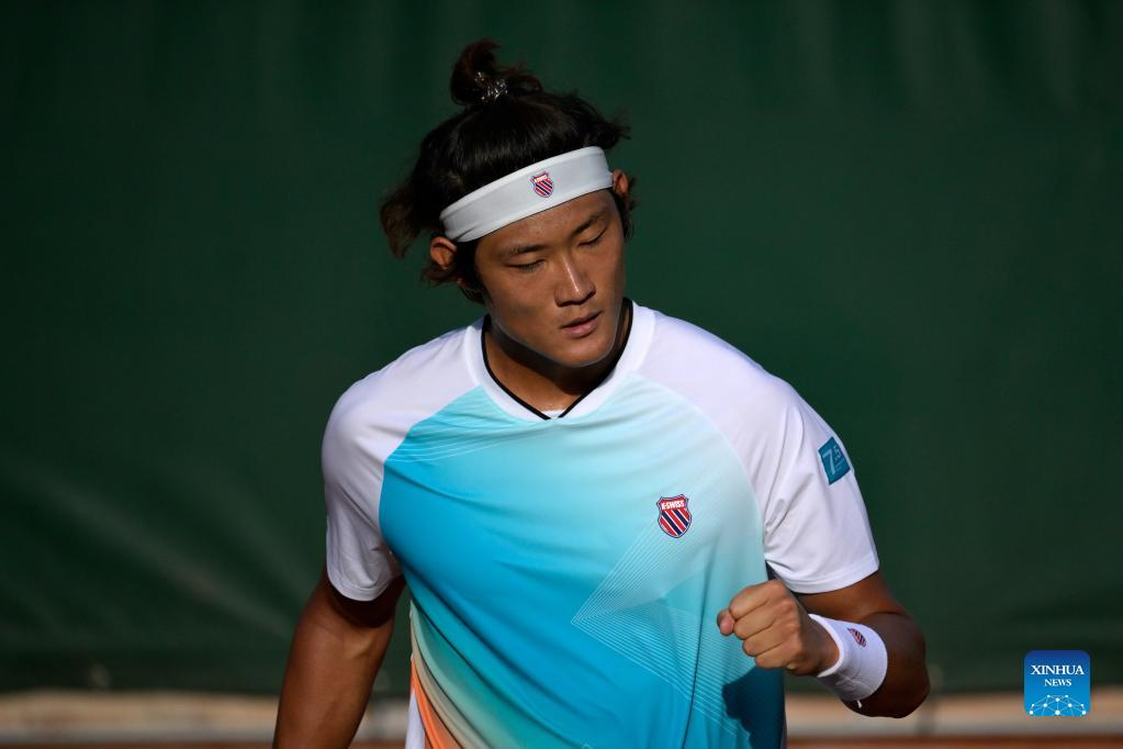 Zhang Zhizhen of China celebrates during the men's singles first round match against Susan Lajovic of Serbia at the French Open tennis tournament at Roland Garros in Paris, France, May 29, 2023. (Photo by Julien Mattia/Xinhua)