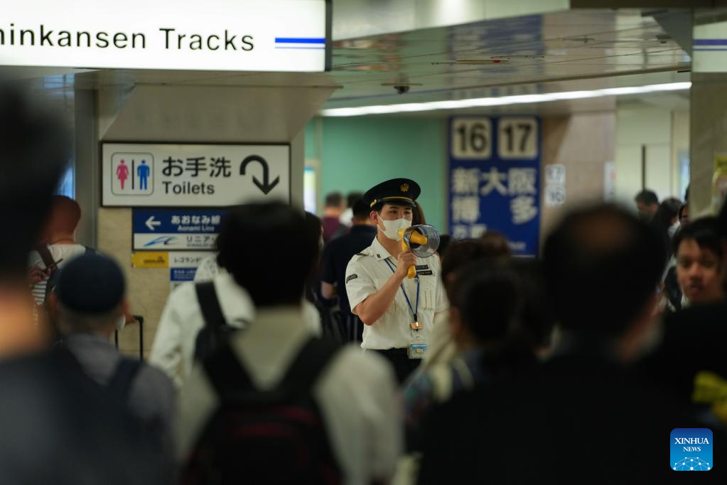 A staff member maintains order at the Shinkansen transfer entrance of Nagoya Station in Nagoya, Japan, June 2, 2023. Many rail transit lines were shut down due to torrential rain in some areas of Japan on Friday. (Xinhua/Zhang Xiaoyu)