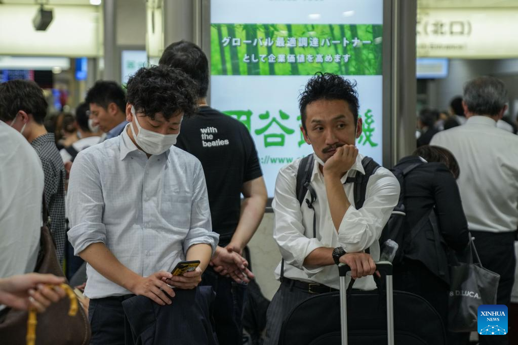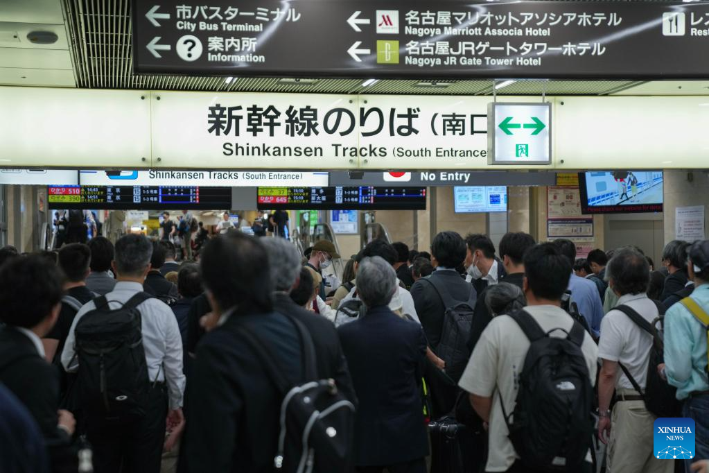 Passengers wait for Shinkansen trains at the entrance to Nagoya Station in Nagoya, Japan, June 2, 2023. Many rail transit lines were shut down due to torrential rain in some areas of Japan on Friday. (Xinhua/Zhang Xiaoyu)