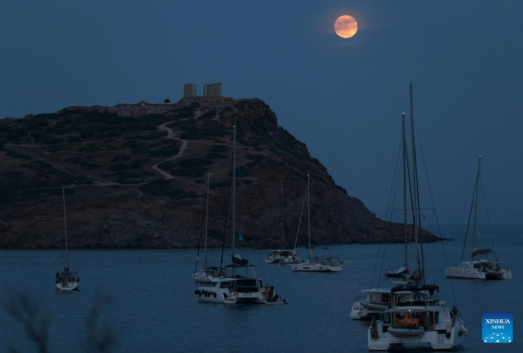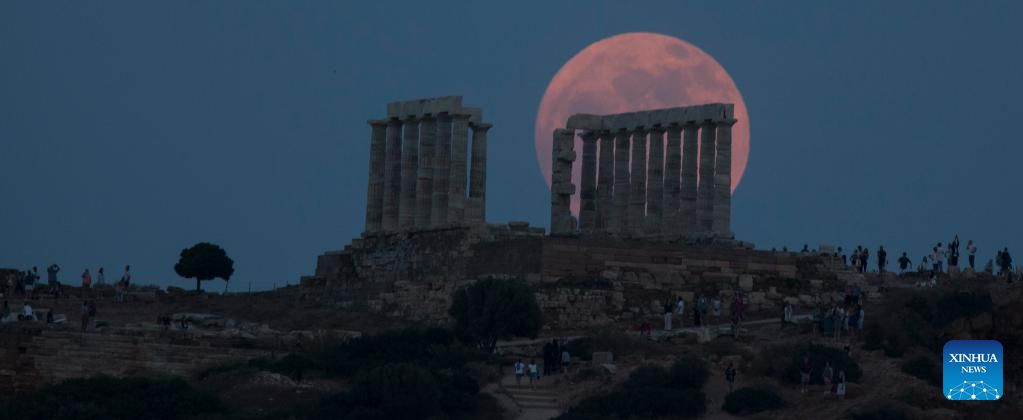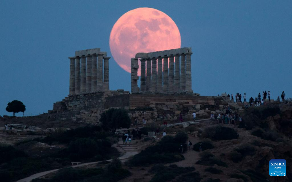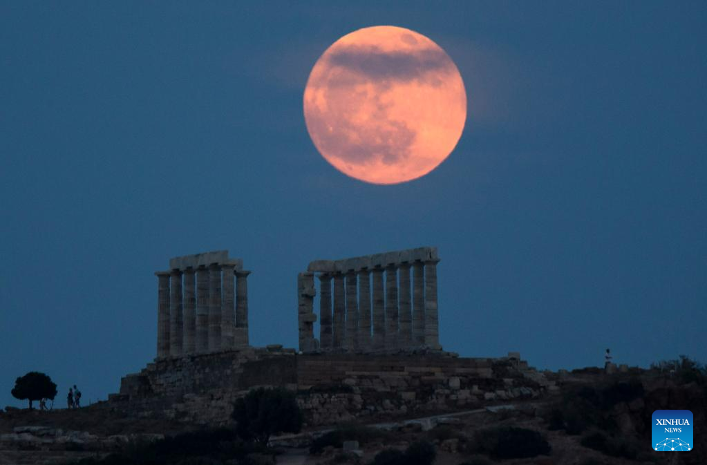 The full moon rises above the Ancient Temple of Poseidon at Cape Sounion, in Sounion, Greece, on June 3, 2023. (Xinhua/Marios Lolos)