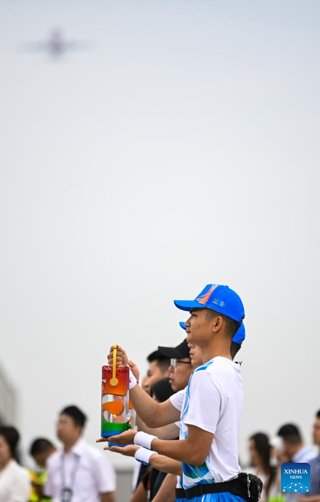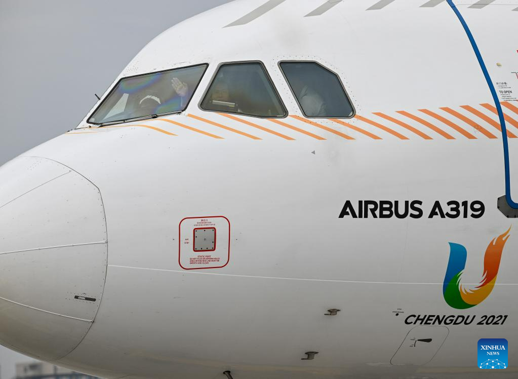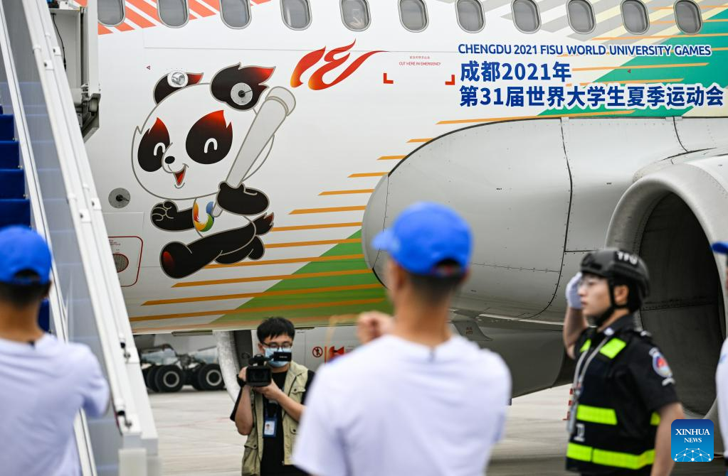 Photo taken on June 8, 2023 shows the plane carrying the World University Games flame at the Chengdu Tianfu International Airport in Chengdu, southwest China's Sichuan Province. The launch ceremony of the torch relay for the 31st FISU Summer World University Games was held at the Chengdu Tianfu International Airport on Thursday.