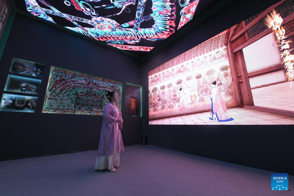 A woman wearing traditional Chinese costume visits the Gansu pavilion at the 19th China (Shenzhen) International Cultural Industries Fair in Shenzhen, south China's Guangdong Province, June 8, 2023.