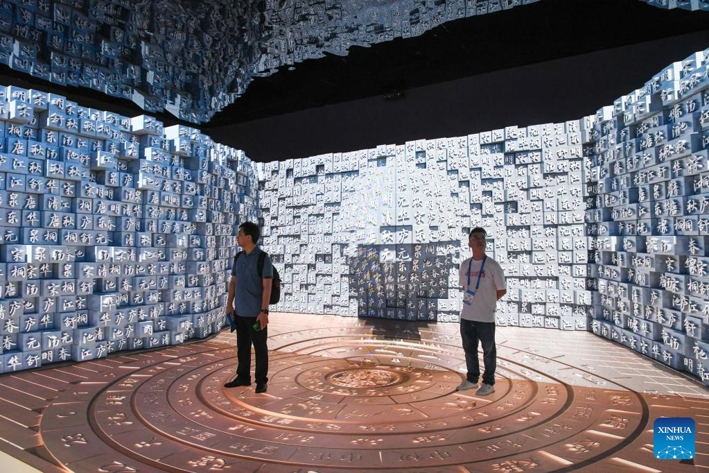 People watch the 3D display of movable-type printing at the 19th China (Shenzhen) International Cultural Industries Fair in Shenzhen, south China's Guangdong Province, June 8, 2023.
