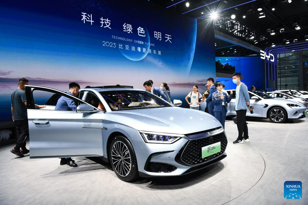 Visitors learn about new energy vehicles of Chinese carmaker BYD during the 27th Guangdong-Hong Kong-Macao Greater Bay Area International Auto Show at the Shenzhen Convention and Exhibition Center in Shenzhen, south China's Guangdong Province, June 16, 2023. The auto show kicked off here on Friday and will last till June 24. (Xinhua/Liang Xu)