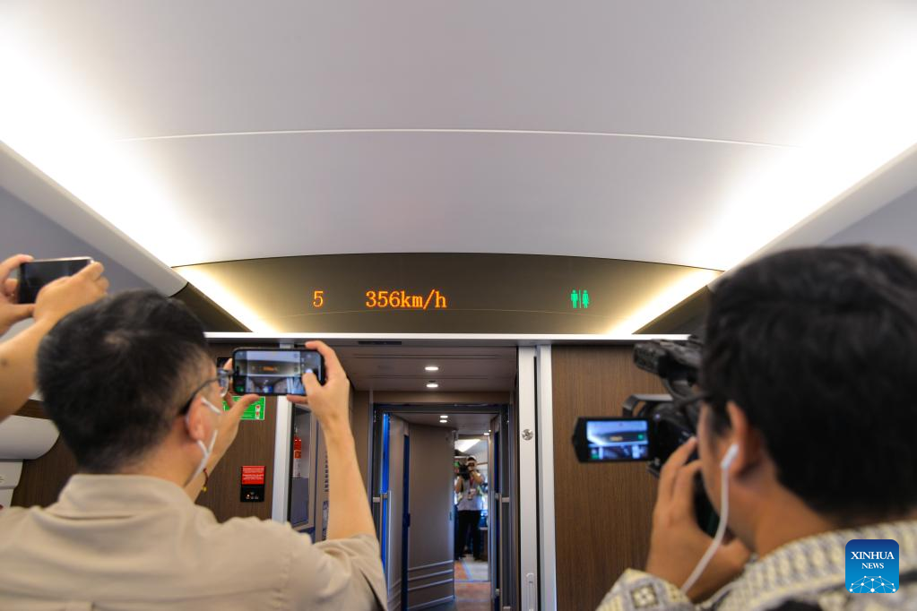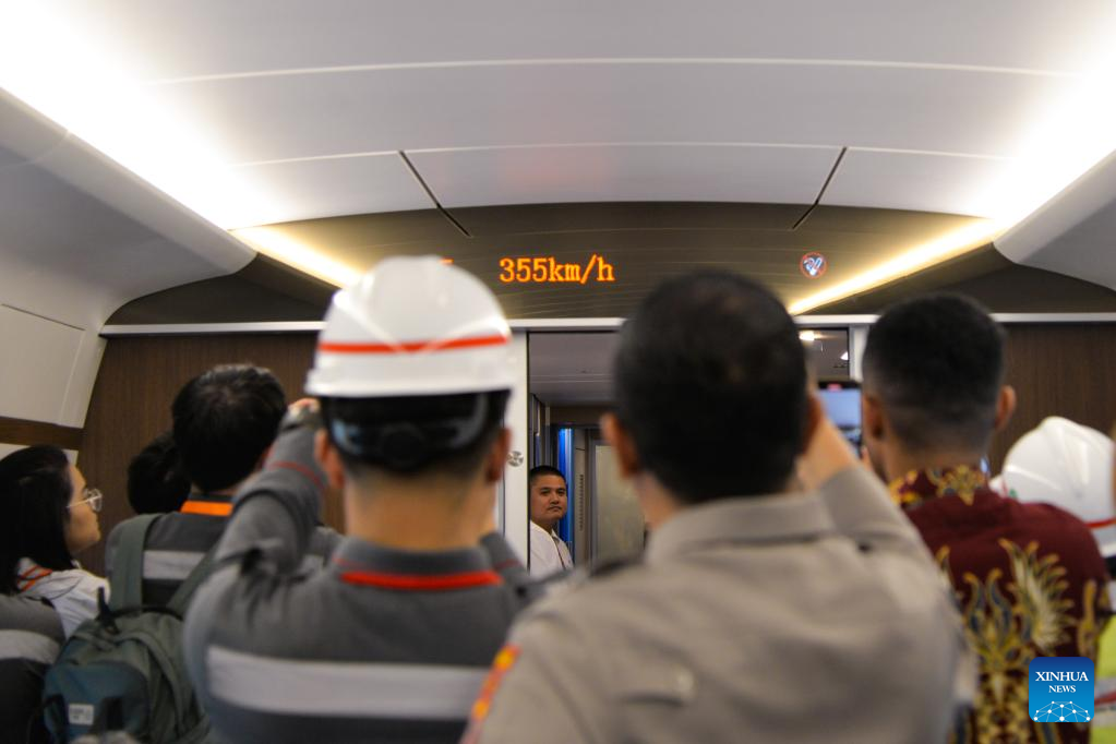 JAKARTA, June 22 (Xinhua) -- The comprehensive inspection train (CIT) of Jakarta-Bandung High-Speed Railway (HSR) reached 350 km per hour, the design speed, for the first time on Thursday during the joint commissioning and testing phase.