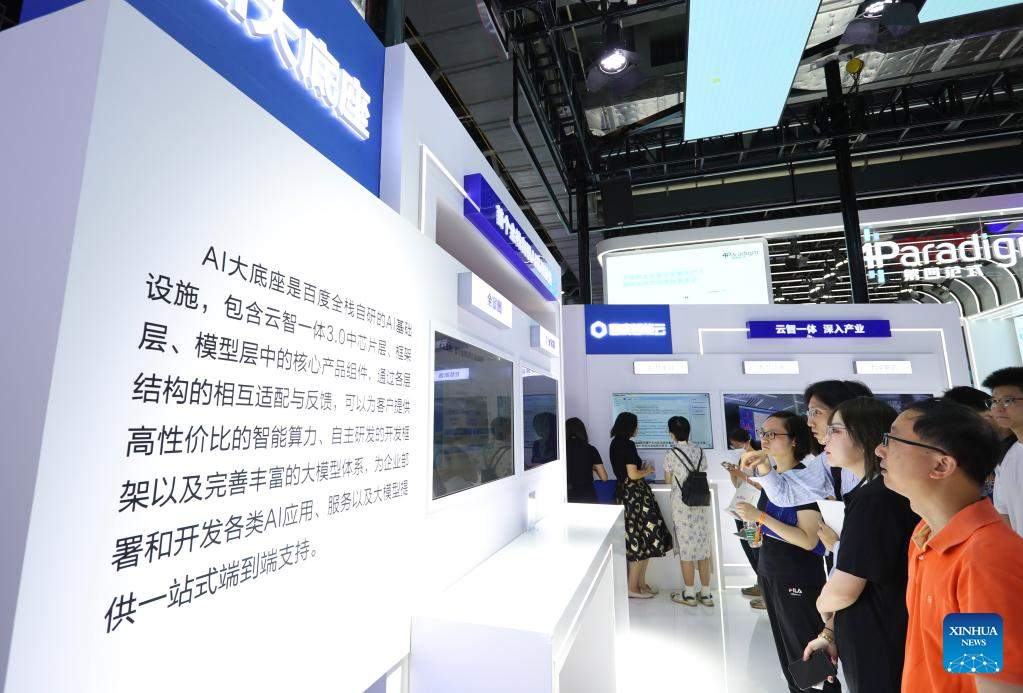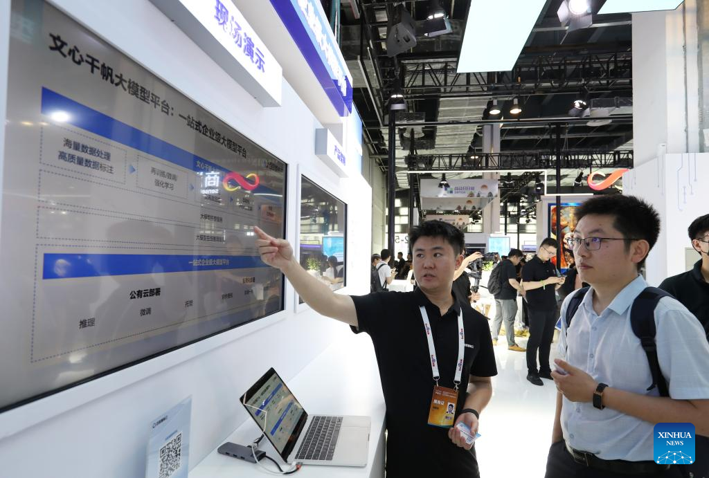 Visitors learn about exhibits from Baidu during the World Artificial Intelligence Conference (WAIC) 2023 in Shanghai, east China, July 6, 2023. Themed "Intelligent Connectivity Generating Future," the three-day WAIC 2023 kicked off in Shanghai on Thursday. The conference's major exhibitions focus on sectors such as core technology, intelligent terminals, application empowerment and cutting-edge technology, with over 400 exhibitors in attendance. (Xinhua/Fang Zhe)