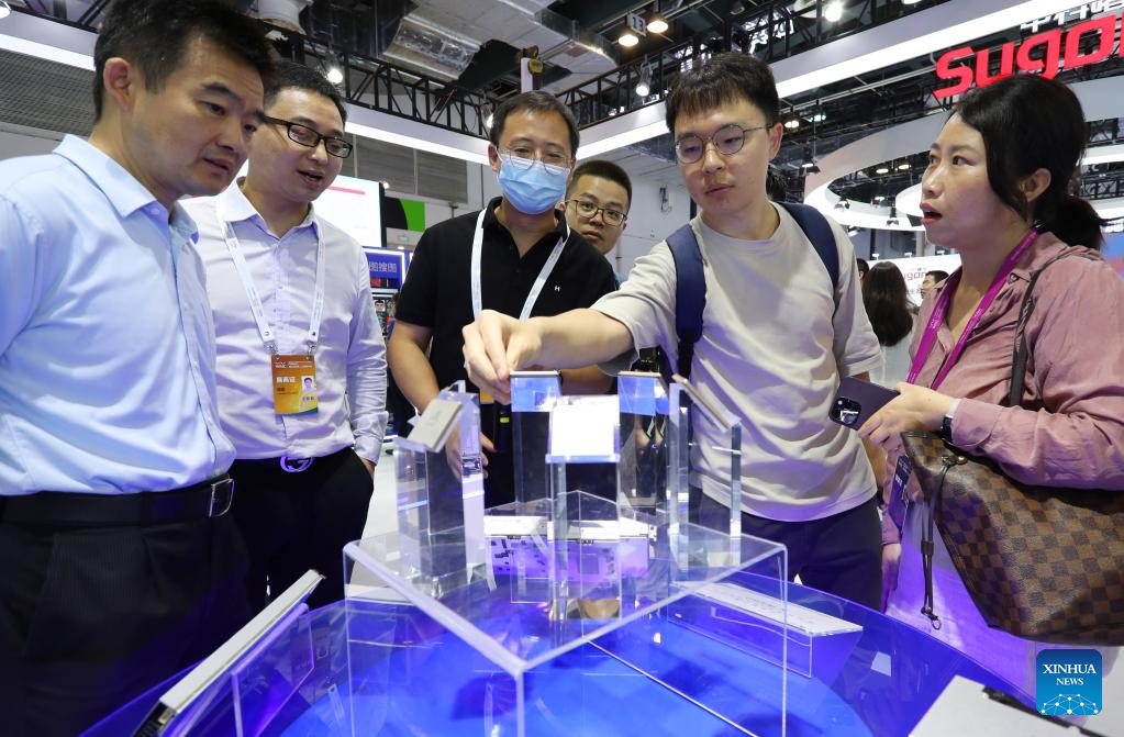 Visitors learn about chips during the World Artificial Intelligence Conference (WAIC) 2023 in Shanghai, east China, July 6, 2023. Themed "Intelligent Connectivity Generating Future," the three-day WAIC 2023 kicked off in Shanghai on Thursday. The conference's major exhibitions focus on sectors such as core technology, intelligent terminals, application empowerment and cutting-edge technology, with over 400 exhibitors in attendance. (Xinhua/Fang Zhe)